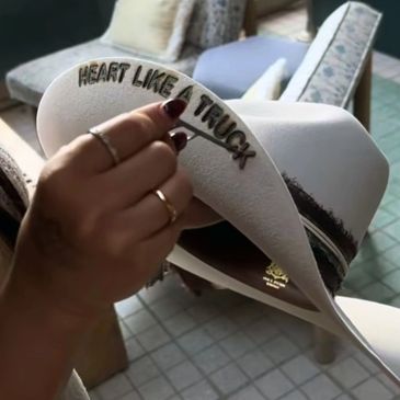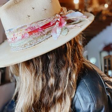 Add bands, feathers, charms, burns, and texture. Feel free to bring us fabrics or pins that hold special meaning to you.